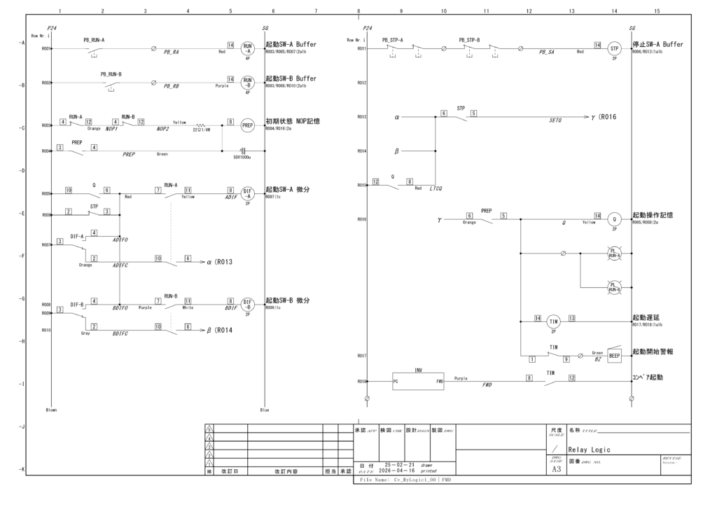 起動SWは直接ロジックに使わず、RUN-A / RUN-B のバッファリレーで受ける。機械式SWは複数接点が同時に切り替わらず、接点ごとにタイムラグが出るためである。